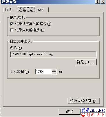 2、设置日志 如图4所示,选择要记录的项目,防火墙将记录相应的数据,日志默认在c:\windows\pfirewall.log,用记事本就可以打开看看。//by http://CiDu.Net/
