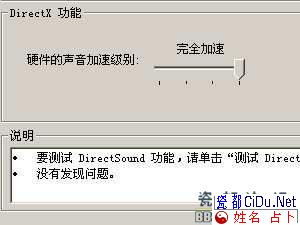 解决方法:进入“_blank>DirectX诊断工具”,选择“声音”选项卡,在“加速级别”中将游标向右拖动到“完全加速”,确定即可。