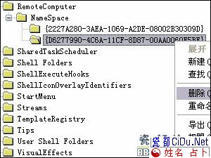 打开注册表编辑,逐级展开子键HKEY_LOCAL_MACHINE\Software\Microsoft\Windows\ CurrentVersion\Explorer\RemoteComputer\NameSpace,选中{D6277990-4C6A-11CF-8D87-00AA0060F5BF},从右键菜单中执行“删除”命令。