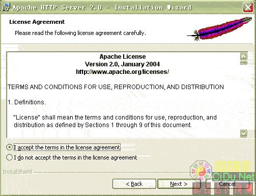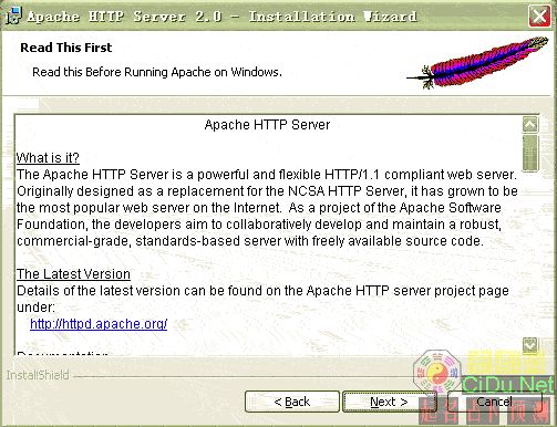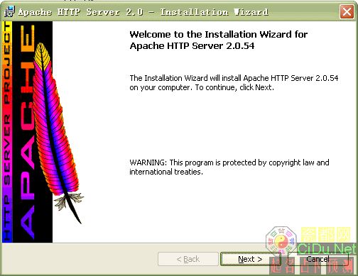 出现Apache HTTP Server 2.0.55的安装向导界面,点“Next”继续