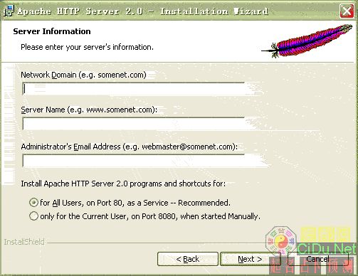 先准备好软件: Apache官方下载地址:apache_2.0.55-win32-x86-no_ssl.msi,更多版本在这里; php官方下载地址:php-5.0.5-Win32.zip,更多镜像下载地址,更多版本下载; mysql官方下载地址:mysql-4.1.14-win32.zip,更多镜像下载地址,更多版本下载。//by http://CiDu.Net/