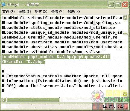 现在开始将php以module方式与Apache相结合,使php融入Apache,照先前的方法打开Apache的配置文件,Ln 173,找到这里,添加进如图所示选中的两行,第一行“LoadModule php5_module D:/php/php5apache2.dll”是指以module方式加载php,第二行“PHPIniDir "D:/php"”是指明php的配置文件php.ini的位置,是当然,其中的“D:/php”要改成你先前选择的php解压缩的目录。//by http://CiDu.Net/
