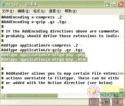还是Apache的配置文件,Ln 757,加入“AddType application/x-httpd-php .php”、“AddType application/x-httpd-php .html”两行,你也可以加入更多,实质就是添加可以执行php的文件类型,比如你再加上一行“AddType application/x-httpd-php .htm”,则.htm文件也可以执行php程序了,你甚至还可以添加上一行“AddType application/x-httpd-php .txt”,让普通的文本文件格式也能运行php程序。//by http://CiDu.Net/