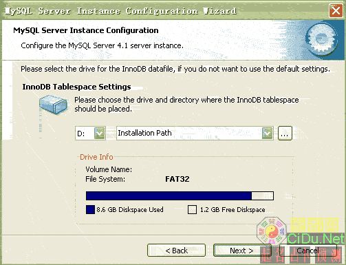 对InnoDB Tablespace进行配置,就是为InnoDB 数据库文件选择一个存储空间,如果修改了,要记住位置,重装的时候要选择一样的地方,否则可能会造成数据库损坏,当然,对数据库做个备份就没问题了,这里不详述。我这里没有修改,使用用默认位置,直接按“Next”继续