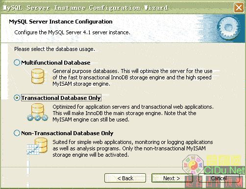 选择mysql数据库的大致用途,“Multifunctional Database(通用多功能型,好)”、“Transactional Database Only(服务器类型,专注于事务处理,一般)”、“Non-Transactional Database Only(非事务处理型,较简单,主要做一些监控、记数用,对MyISAM数据类型的支持仅限于non-transactional),随自己的用途而选择了,我这里选择“Transactional Database Only”,按“Next”继续。//by http://CiDu.Net/