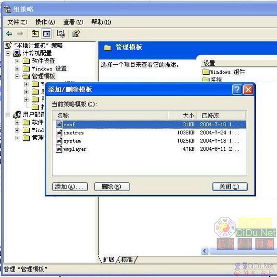 右键点击“管理模板”后选择“添加 / 删除模板”,如下图所示: