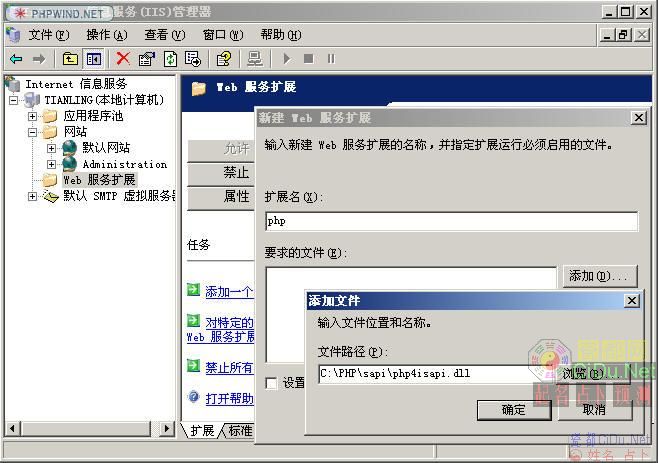 第四步 控制面版——》管理工具——》Internet服务管理器——》点选“Web 服务扩展”——》在右边窗口点击“添加一个新的 Web 服务扩展”——》扩展名为 “PHP”——》再点击“添加”——》在出现的窗口里填上“C:\PHP\sapi\php4isapi.dll” 并确定 然后再点选 Web 服务扩展 PHP 并选择允许 如图所示
