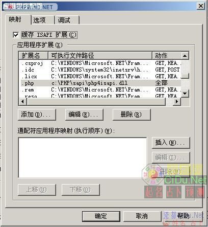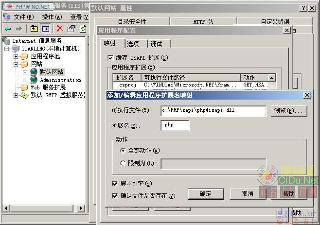 第五步 在“默认网站属性”窗口上按 “主目录”标签 点“配置”按钮 在弹出的“映谢”窗口中点取“添加”按钮,在弹出的“添加/编辑应用程序扩展名映像”对话框中的“可执行文件”文本框中输入“c:\PHP\sapi\php4isapi.dll” “扩展名”文本框中输入“.php”(注意一定要有那个点) 并勾选 "检查文件是否存在"项 确定 如图所示