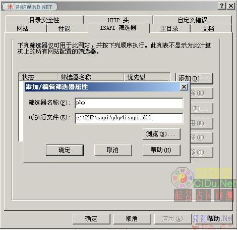 第六步 在“默认Web站点属性”窗口上点取“ISAPI筛选器”标签,点击“添加”按钮,在弹出的“筛选器属性”窗口的“筛选器名称”中输入“PHP” “可执行文件”中浏览选定“c:\PHP\sapi\php4isapi.dll” 然后确定 如图所示