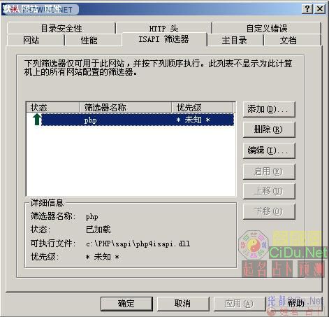 B:在“默认Web站点属性”窗口上点取“ISAPI筛选器”标签 如果看到 PHP 的箭头绿色且向上 证明 PHP 已经被 IIS 6.0 顺利加载起来了 见图