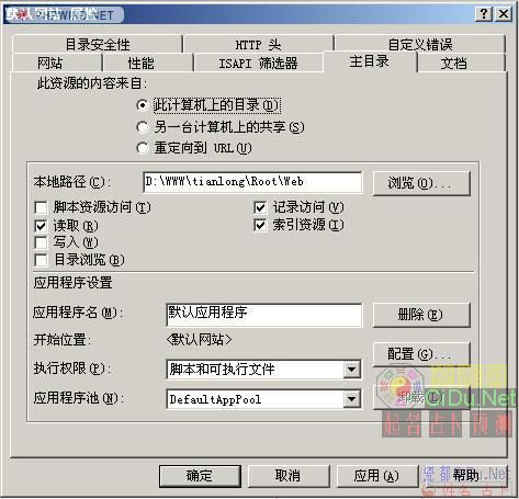 第七步 在“默认网站属性”窗口上按 “主目录”标签 修改 如果在IIS6.0里对PHP配置为CGI运行模式 即全部加载PHP.exe 执行权限 为“脚本和可执行文件” 反之 运行在ISAPI模式下 即全部加载PHP4isapi.dll 则保持默认的"纯脚本"即可 这样可进一步加强系统的安全性 应用程序池 为 “ DefaultAppPool” 确定即可 如图所示