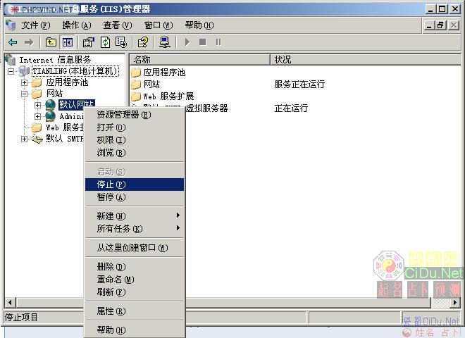A:先停止 IIS 6.0的运行 再重新启动IIS 6.0 意在开始对 PHP 加载 见图