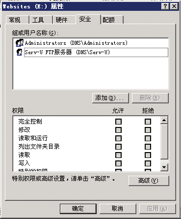 • 给你的WEB服务的磁盘或文件夹添加SERV-U添加编辑删除权限(完全控制也行),注意:WEB服务的磁盘或文件夹保留一个SERV-U用户就行了另一个是administrators组(完全控制也行)。不会影响运行asp、php(本人测试过的)