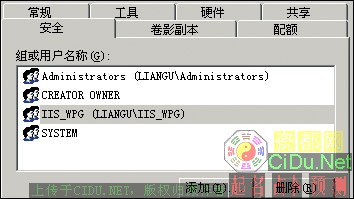 第一步是有别于Windows 2000设置的关键:右击C盘,点击“共享与安全”,在出现在对话框中选择“安全”选项卡,将Everyone、Users组删除,删除后如果你的网站连ASP程序都不能运行,请添加IIS_WPG组(图1),并重启计算机。