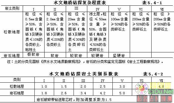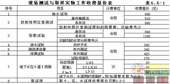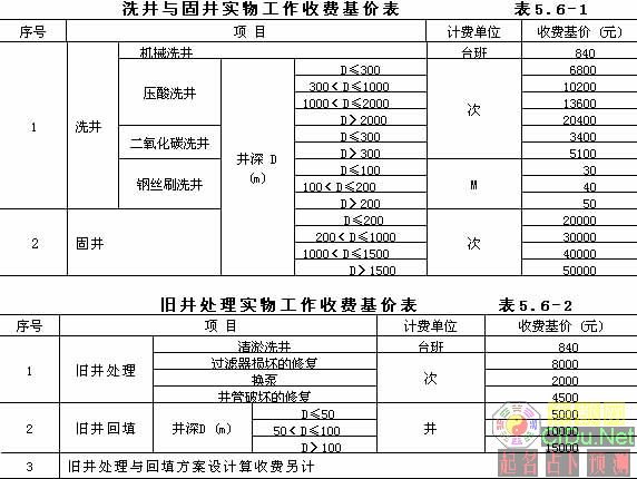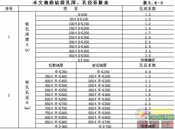 5.4 水文地质钻探 水文地质钻探实物工作收费基价按所钻探地层分层计算,计算公式如下: 水文地质钻探实物工作收费基价=130元/(米)×自然进尺(米)×岩土类别系数×孔深系数×孔径系数