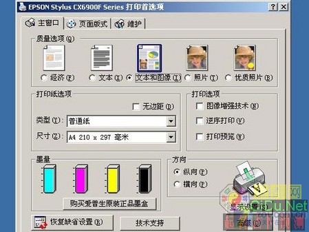 在打印设置的主窗口中,我们可以自如的调节打印质量和纸张类型等设置,下面还可以显示当前的墨量剩余状态。值得一提的是,默认情况下它的打印质量设置为“文本和图像”,适合打印带有插图的文档,但同时也会影响它的打印速度。如果你的打印操作以纯文本或黑白图文为主,我们建议你将设置调整为“文本”,打印速度将会提升30%左右,而质量并没有明显下降。//by http://CiDu.Net/