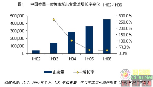 根据IDC的定义,多功能一体机通常包含打印、复印、扫描、传真等多项功能中的两种或者两种以上,且其中一种必须是打印功能。多功能一体机根据成像技术的不同可分为喷墨一体机和激光一体机。虽然国内最早出现的是激光一体机,但喷墨一体机以后来者居上的姿态,在过去的4年中以63%的年复合增长率高速成长,远高于激光一体机的发展速度。根据IDC最新发布的报告,2006年上半年喷墨一体机的新机出货量已接近45万台,比2002年同期增长109.3%,预计全年超过百万。
