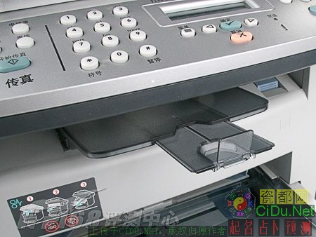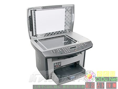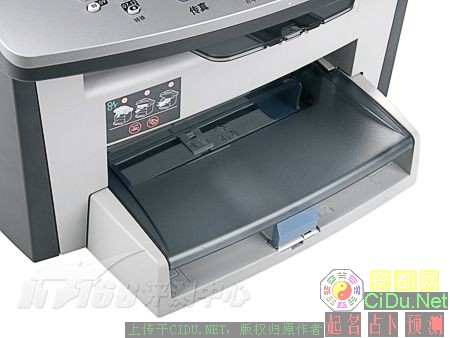HP 3055提供两个进纸器,一个是容量250页的自动进纸盒,另一个是10页的优先纸盒。自动进纸盒采用半封闭设计,盒盖的上方构成了手动进纸器。自动进纸盒容量为250页,可以满足一般小型企业和工作组的要求。出纸仓在机身中部,容量为100页,二级伸缩设计,硬塑料材质相对稍显脆弱。//by http://CiDu.Net/
