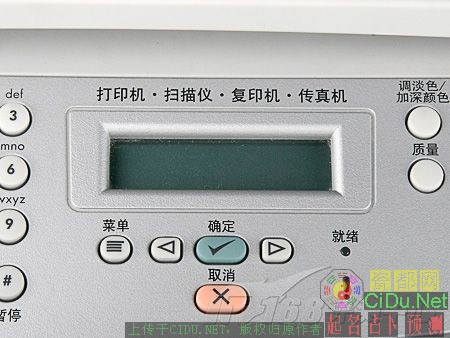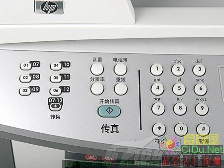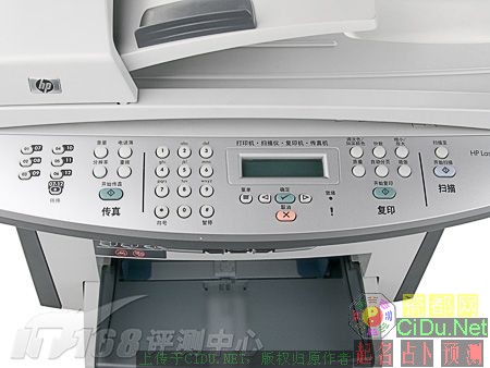 3055的按键区内容很丰富,对于菜单、控制、扫描、复印和传真都有相应的按键予以控制。正中间的是液晶屏,可以同时容纳2行字符,遗憾的是不支持中文显示,同时菜单的操作相对比较繁杂。左侧是传真区,3055支持号码重播、分辨率选择、电话本和快速拨号这些设计,电话本可以存储120个号码,另外还设计有12个快速拨号的位置。//by http://CiDu.Net/