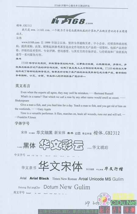 HP 3055有一个比较大的问题是在进纸时不能进行位置调整,在输出的时候经常会出现整体倾斜的现象,我们需要在装入纸张的时候严格的控制位置。从样张的整体表现看,文本的黑度比较饱满,字迹清晰。小字体的测试中,3055可以清晰输出2号字体,1.5号字体也可以识辨,但是笔画有重叠和丢失现象。华文彩云的字体方面表现出色,毛刺现象很轻微,边缘圆滑连贯,镂空方面也比较准确的表现了出来。华文行楷的字体表现中,表现出了足够的力度,笔锋连带苍劲有力。//by http://CiDu.Net/