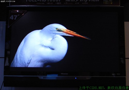 通过图片可以看出,此款电视在黑白对比方面做的不好,白色鸟的尾部本来有几根白色的稀疏羽毛,但是在这台电视上完全看不到了。细节白色部分被黑色吞没掉了。//by http://CiDu.Net/