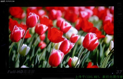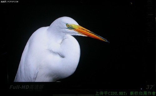 通过图片测试我们可以看出,这款电视黑白对比度表现一般,白色鸟尾部的羽毛只有一根可以看得很清楚,另外一根比较模糊。在红色和绿色的鲜艳程度上,可以看出,红色的表现比较突出,色彩的鲜艳程度很不错。//by http://CiDu.Net/