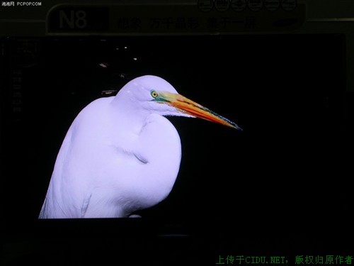 通过图片的测试我们可以看出,黑白对比度非常明显,对于黑色的表现非常透彻,只是由于屏幕有些反光,所以在拍摄的图片中可以看到白色鸟多了一个光环,这只是拍摄问题,真正观看的时候并没有这样的现象产生。//by http://CiDu.Net/