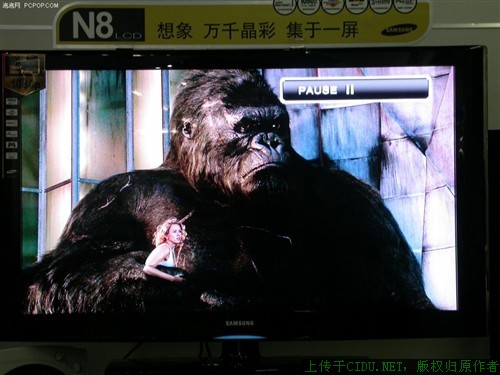 在影片测试方面,黑水晶的黑色表现突出的特性表现了出来,从黑色的金刚就可以明显得发现,毛发的层次感很强,因为影片的整体色调有些偏黑,在其它电视上播放的时候时有发暗的现象,但这款电视比较明亮,对黑色诠释很有通透感,层次分明,感觉非常真实。在观看了带有字幕的影片后,看到字幕和夏普,索尼相同都有丢笔划现象。//by http://CiDu.Net/