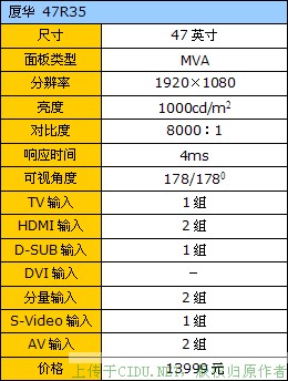 厦华47R35的外观设计感觉非常规矩,垂直的四角设备感觉非常的死板。比较创新的设计是卧式一体化音箱和底边之间采用了凹陷的设计风格,并用银色装饰线隔开,总算还有些创新。//by http://CiDu.Net/