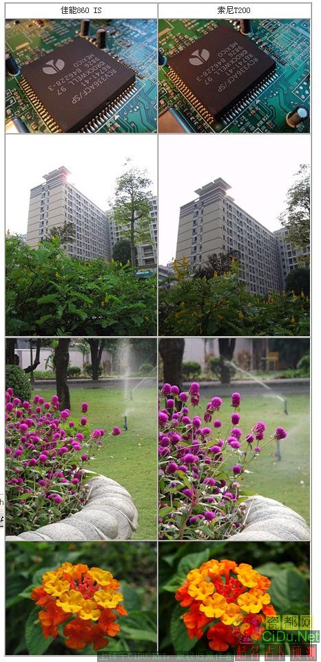 通过各方面的对比评测,我们可以看到两款机型所特有的地方。佳能860 IS以拍摄性能好为焦点,拥有28mm广角镜头、3.0英寸23万像素,显示优良的晶炫LCD,并且有比较丰富的颜色控制功能,在感光度和白平衡上均优胜于索尼T200,并且在实拍样张对比中也表露无遗,有着较为优秀的画质和紫边控制能力。可以说佳能860 IS是一台拍摄利器。//by http://CiDu.Net/