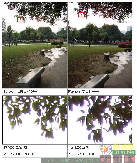 通过样张二的对比,可以看到索尼T200的宽容度还是逊色于佳能860 IS。近处的草地和树叶都几乎变成剪影。同样的索尼T200的颜色也较为的暖,没有佳能860 IS的那么自然。//by http://CiDu.Net/