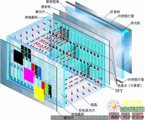 从上图中我们不难看出,液晶通过光线照射,利用电压使液晶分子转动,最后通过滤光片色轮来决定显示出画面的色彩,最终达到成像。不过液晶面板本身是不发光的,而是要依靠电视的背光源来照亮,所以这样就可以得到一个无闪烁的液晶面板,不过也因为这样,液晶电视的亮度较高,而对比度方面一直不能达到很高的值。//by http://CiDu.Net/