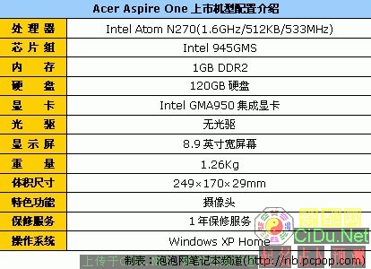 Acer Aspire One A150(1GB/120GB)采用8.9英寸宽屏幕(LED背光模组)设计,Intel Atom N270处理器(1.6GHz主频/512KB二级缓存/533MHz前端总线)、Intel 945GMS芯片组、1GB DDR2内存、120GB硬盘和Intel GMA950集成显卡。目前,它的经销商报价为2944元。//by http://CiDu.Net/