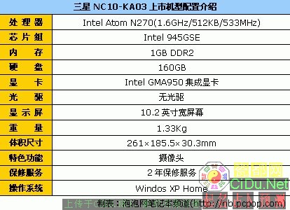 三星NC10-KA03采用10.2英寸宽屏幕(LED背光模组)设计,配备了Intel Atom N270处理器(1.6GHz主频/512KB二级缓存/533MHz前端总线)、Intel 945GSE芯片组、1GB DDR2内存和160GB硬盘。目前,它的经销商报价为3750元。//by http://CiDu.Net/