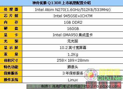 编辑观点:神舟优雅Q130R是一款10.2英寸宽屏幕上网本,采用全主流配置设计,并且提供了无线网卡和摄像头。想要购买低价格上网本的消费者,不妨考虑一下这款产品。//by http://CiDu.Net/