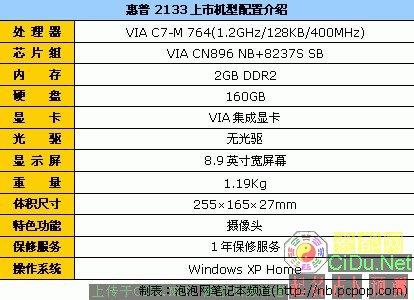 惠普Compaq 2133(FH424PA)采用8.9英寸宽屏幕设计,配备了VIA C7-M 764超低电压处理器(1.2GHz主频/128KB二级缓存/400MHz前端总线)、VIA CN896 NB+8237S SB芯片组、2GB DDR2内存、160GB硬盘和VIA集成显卡。目前,它的经销商报价为4580元。//by http://CiDu.Net/