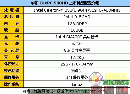 华硕EeePC 900HD采用8.9英寸宽屏幕设计,配备了Intel Celeron-M 353处理器(0.9GHz主频/512KB二级缓存/400MHz前端总线)、Intel 915GMS芯片组、1GB DDR2内存、160GB硬盘和Intel GMA900集成显卡,并预装Linux操作系统。目前,它的经销商报价为2699元。//by http://CiDu.Net/