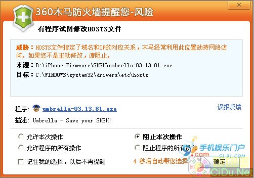 如果您安装了360等安全工具可能会提示您Umbrella正在修改host文件,请选择允许本次操作,并按下确定按钮。(XMW)