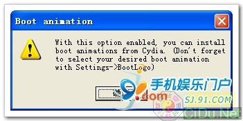 如果勾选了"Allow boot animation"点击"Next"的话会弹出一个对话框,大概说的意思就是:"您启动了开机动画效果,可以从Cydia上面下载到您所需要的开机动画后,在设置中的BootLogo里面选择..."直接点确定就行...