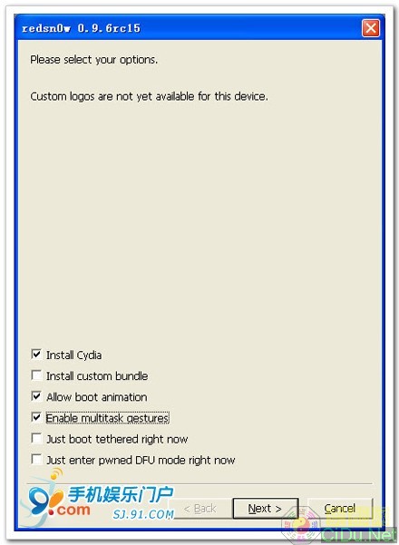 第六步:选择安装Cyida,在“Install Cydia”前面打勾,然后点击“Next”。(如果您需要启动开机动画,请勾选"Allow boot animation"选项,如果没有特别需要,不建议勾选...)