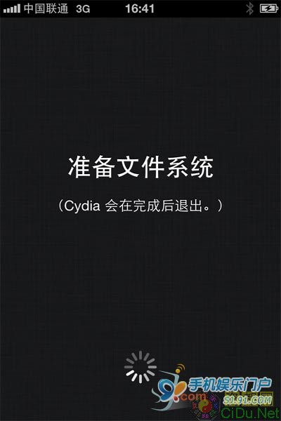 等上面这个页面完成后,iPhone重新启动并进入主页面,打开cydia,这里要注意:第一次打开Cydia时,cydia都会自动进行文件的移动等操作,请勿强行中断避免功能丢失,直到屏幕下方的“菊花”消失后,iPhone将重启。另外也可以在iPhone设置--通用--自动锁定,将自动锁定改为“永不”,避免在cydia文件移动过程中屏幕锁定导致移动中断。