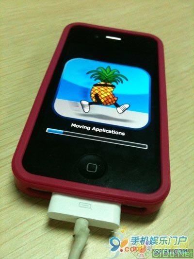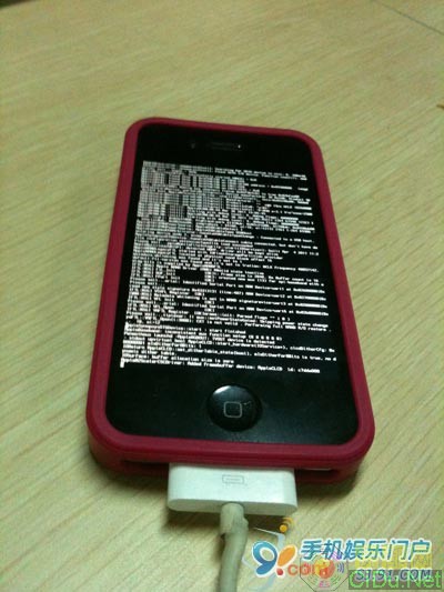 3.6 红雪正在自动完成越狱,这个时候iPhone先白屏,然后跳动一堆代码,之后是菠萝出现。这个等待过程会有点长,淡定。完成后,iPhone将重启。(XMW)