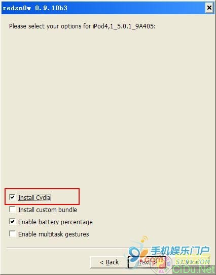 3.5 进入这一步要注意,已经是5.0.1不完美越狱的用户,或者已经越过的用户,需要将“install cydia”前的勾去掉,意思就是在接下来的越狱过程中,不再安装cydia;刚刚升级到iOS 5.0.1并从未越狱过的用户,则将该选项勾起来。然后点击next进入下一步。(如果需要开启多任务手势,请把第4个勾Enable multitask gestures也勾上)。(XMW)