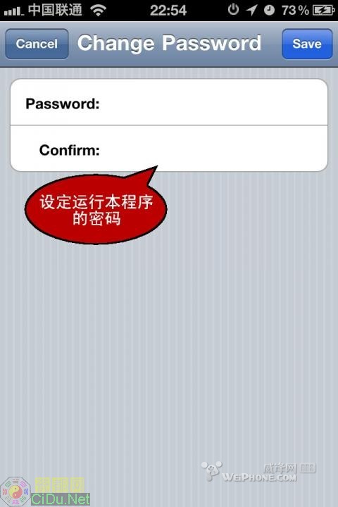 可以看到,地理位置短信是一个网站链接,估计点这个网址就会在地图上看到具体的地点。网址中的网站是该软件开发者的网站,我没有去试。不过,你可以看到这个URL里面已经包含了经纬度,你用经纬度直接在电脑Google地图上定位,一样能看到具体地点。 这里加一项重要的补充,如果你安装了中国地图偏移补丁,一定要在设置中把这个程序排除在外,否则,给你发来的位置会偏差约2-3公里。详细请参考地图补丁的使用帖子。 8、图3中的最后一项,是设置进入本程序的密码。点击它出现下图a的界面。