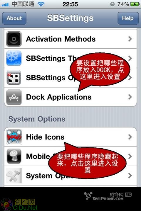 在图c中,点击more按钮,进入SBsettings的设置窗口。出现下图D的界面。
