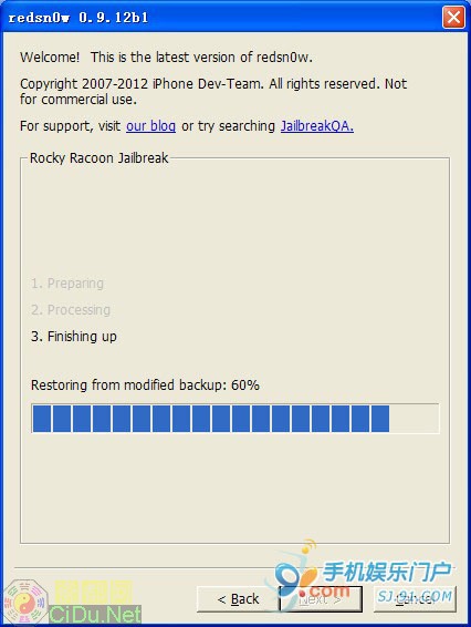 4.3、将Redsn0w下载后,将其解压,然后打开Redsn0w 0.9.12b1,点击jailbreak按钮,越狱就开始了,无需进入DFU模式。(XMW)