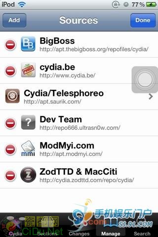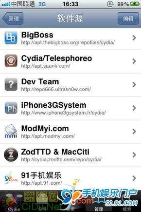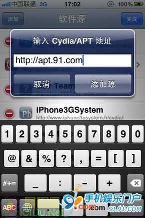 5.1.4:弹入方框后输入http://apt.91.com(91源)后,点击Add Source(加入软件源)
