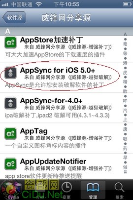 源添加好后,点击“威锋网分享源”进入列表,找到 AppSync for iOS 5.0+,更快捷的方法是点击 Cydia 右下角的“搜索”,输入“AppSync”快速定位目标。如下面 3 张图。