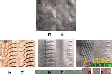 截至目前,假钞的印刷工艺均是胶印、丝网等平印,质量很差。有些假钞为模仿真钞的凹印效果,在人像衣服、团花及手感线等凹凸位置用坚硬金属磨具进行了压痕处理,触摸有凹凸效果,应仔细观察(见下图)。//by http://CiDu.Net/