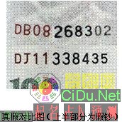 一般假钞使用普通黑色油墨胶印冠字号码,其形态与真钞冠字存在差异且不具备磁性特征。且假钞号码不规则、排列零乱(见下图)。//by http://CiDu.Net/